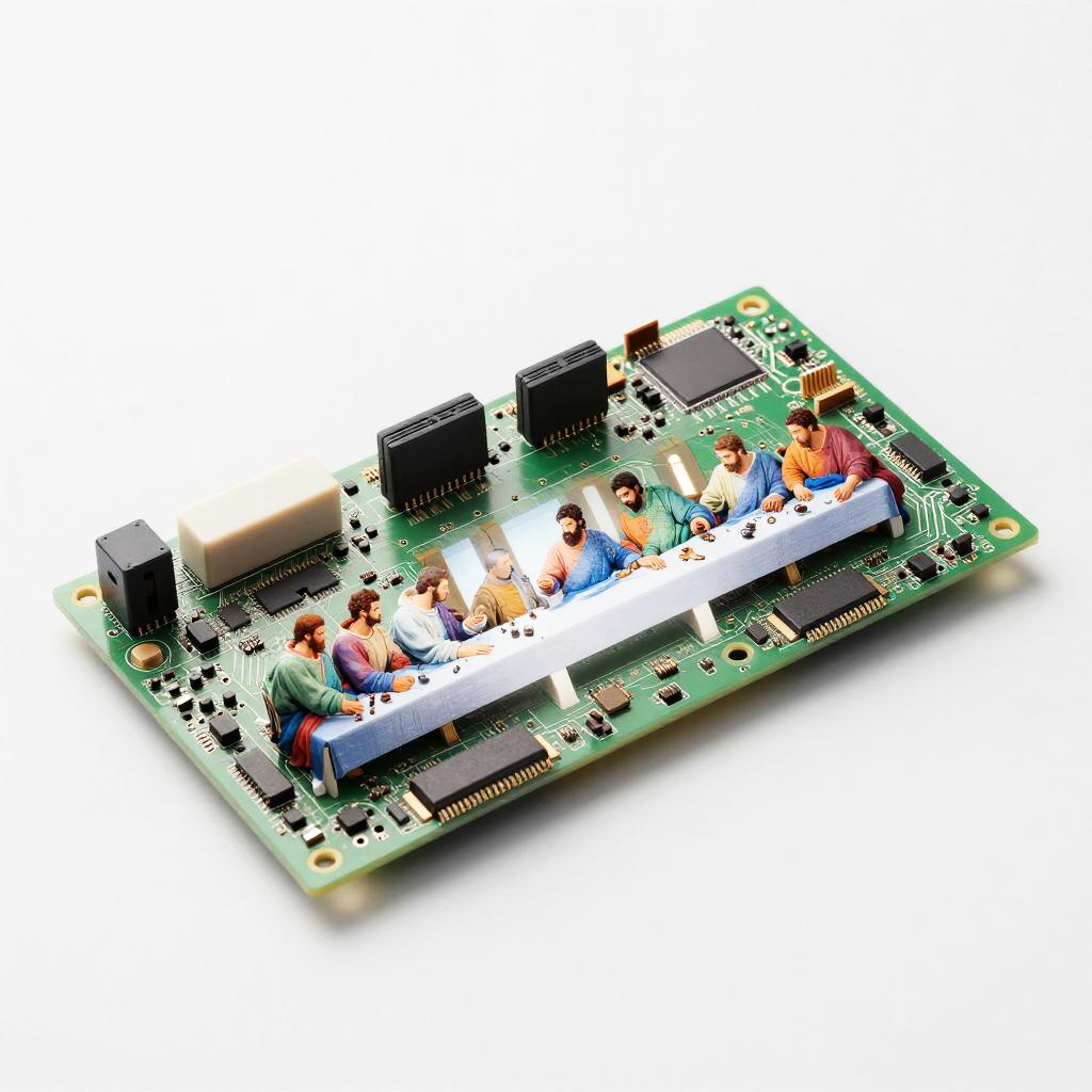 Realistic photo.last supper in minimalist design, PCB, motherboard, highly detailed realistic photo