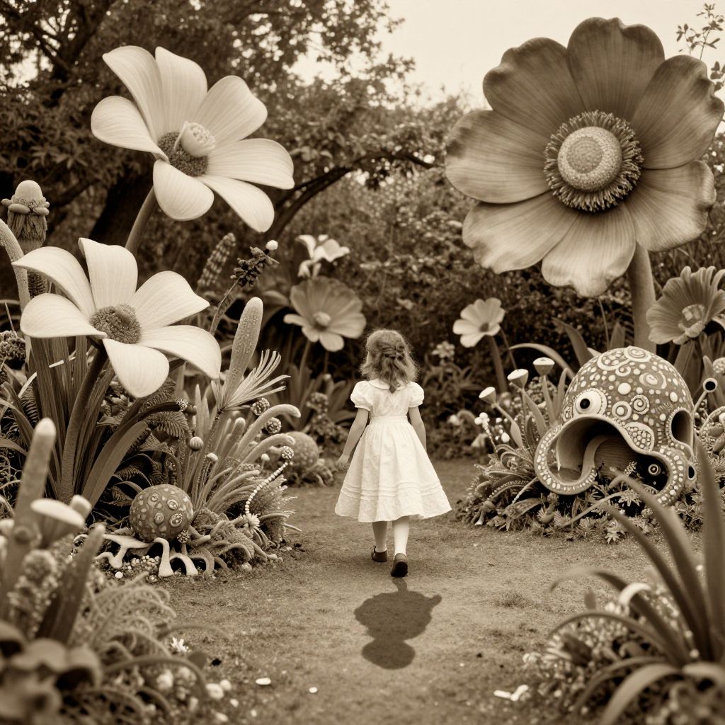 Sepia-toned photograph of a young girl in a white dress walking through a whimsical garden with oversized flowers and intricate, patterned mushrooms.