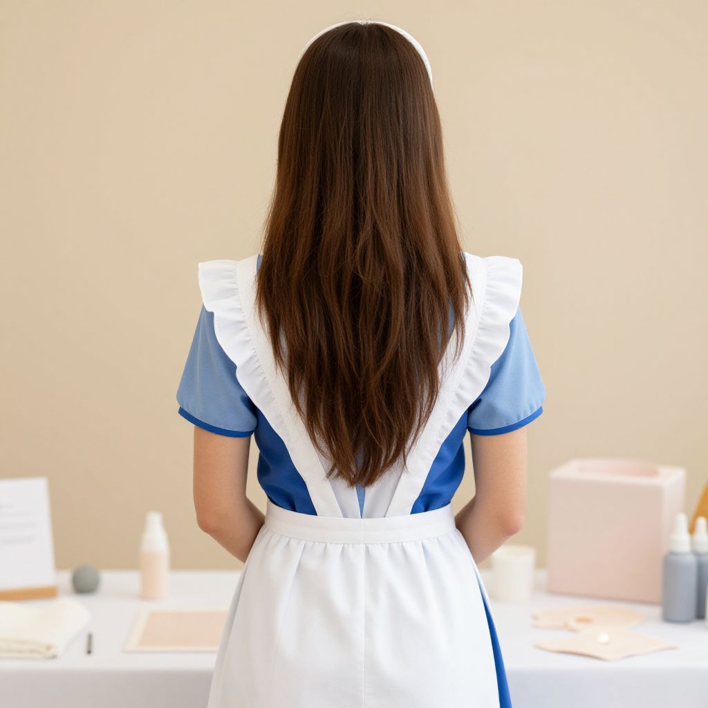 A woman with long brown hair is wearing a white and blue dress with a white apron and a white headband. The woman is standing in front of a table with various items on it.