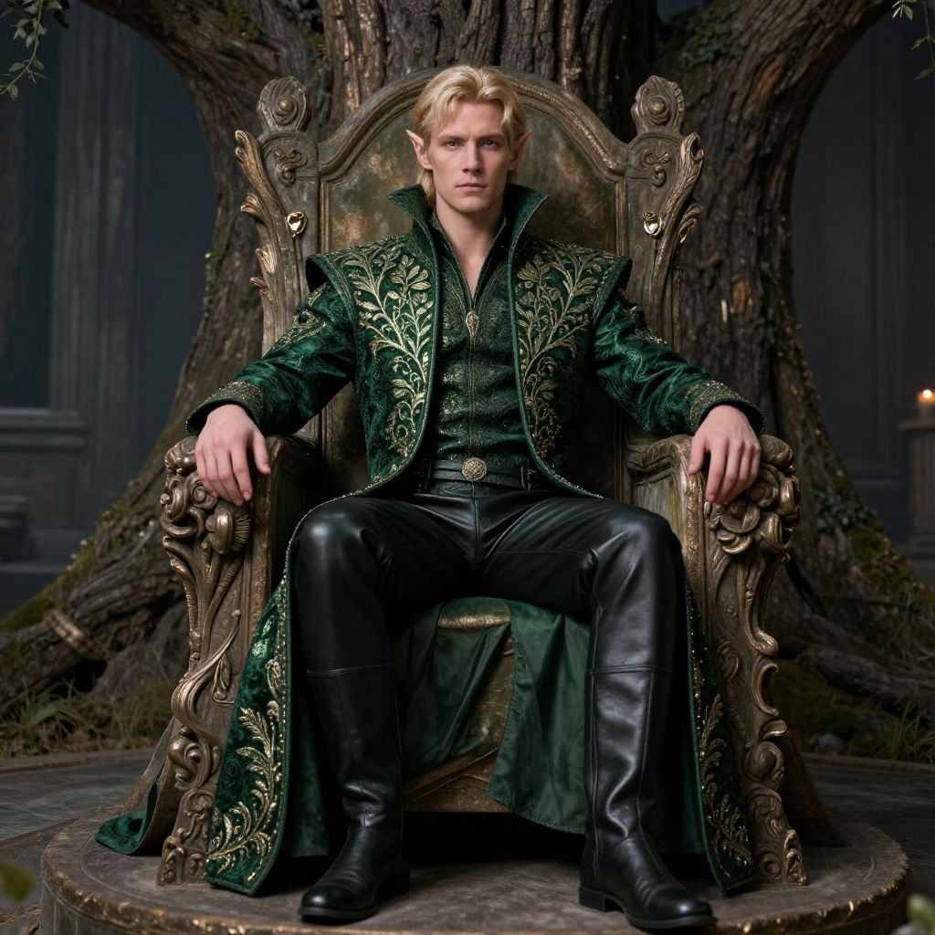 Royal male elven clothing, finely tailored jacket with intricate leaf and vine embroidery in shimmering metallic threads over dark green fabric, paired with soft leather trousers and elegant boots, elven noble posed in a majestic ancient tree throne room, fantasy art style