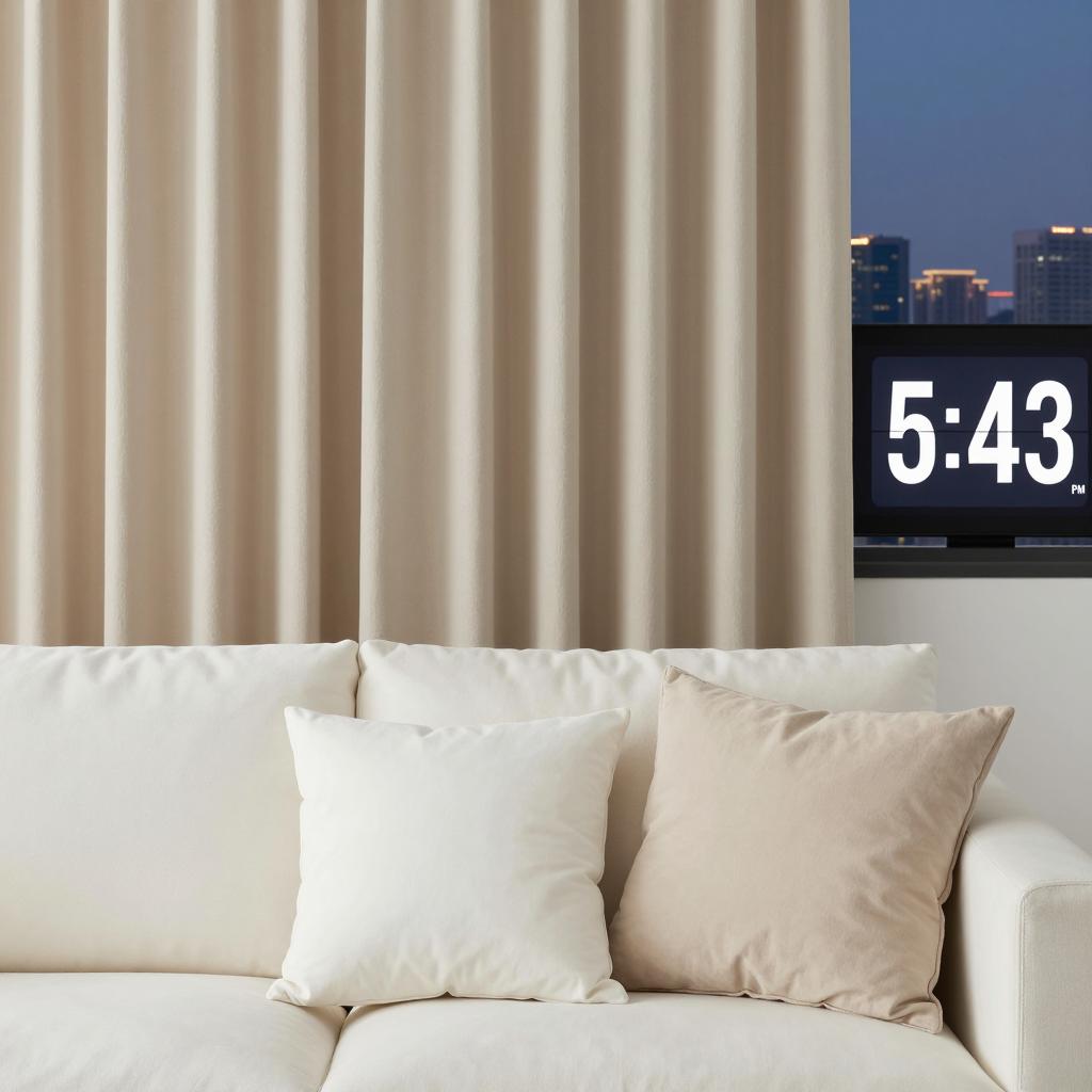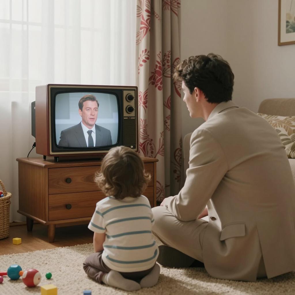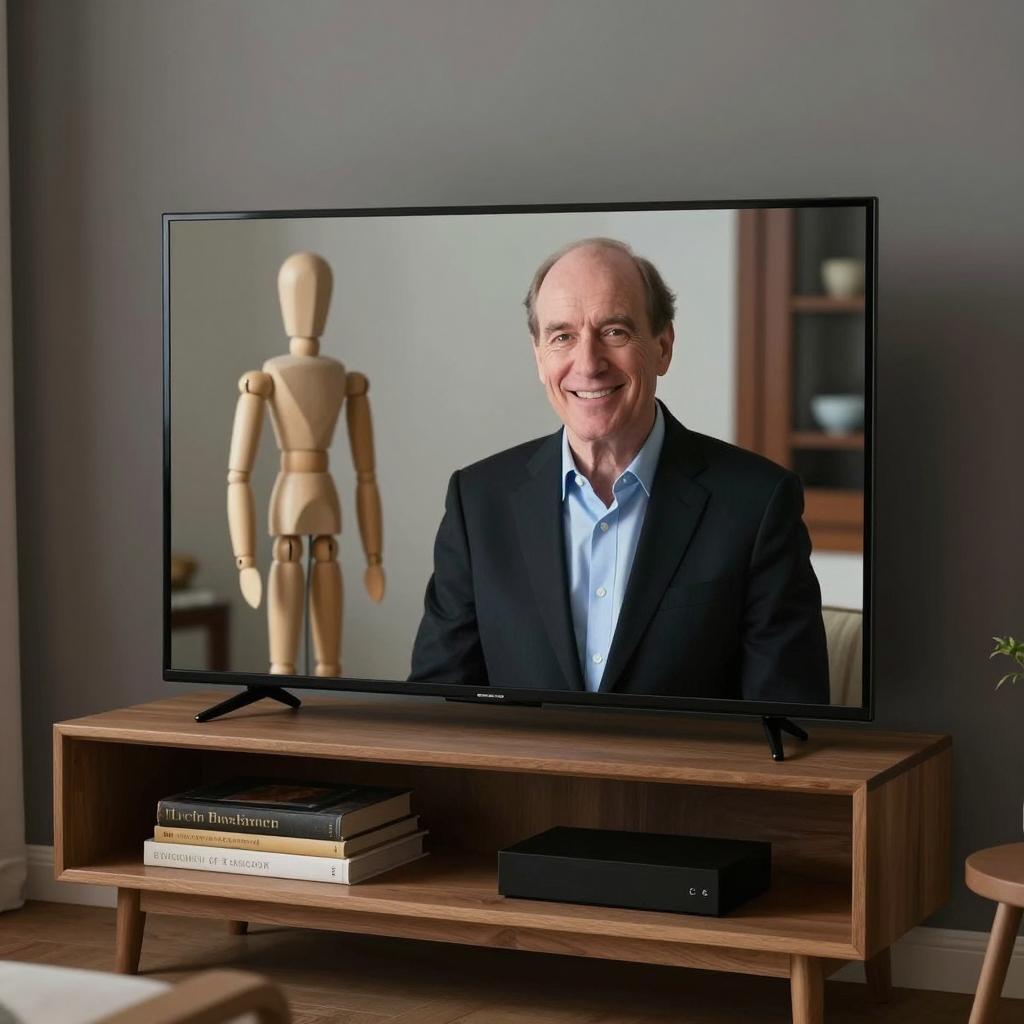 Television on a wooden stand in a dimly lit room. Screen shows a middle-aged man with balding hair, smiling, wearing a black suit and light blue shirt. Wooden mannequin stands in the background. Books and a chair in the lower left.