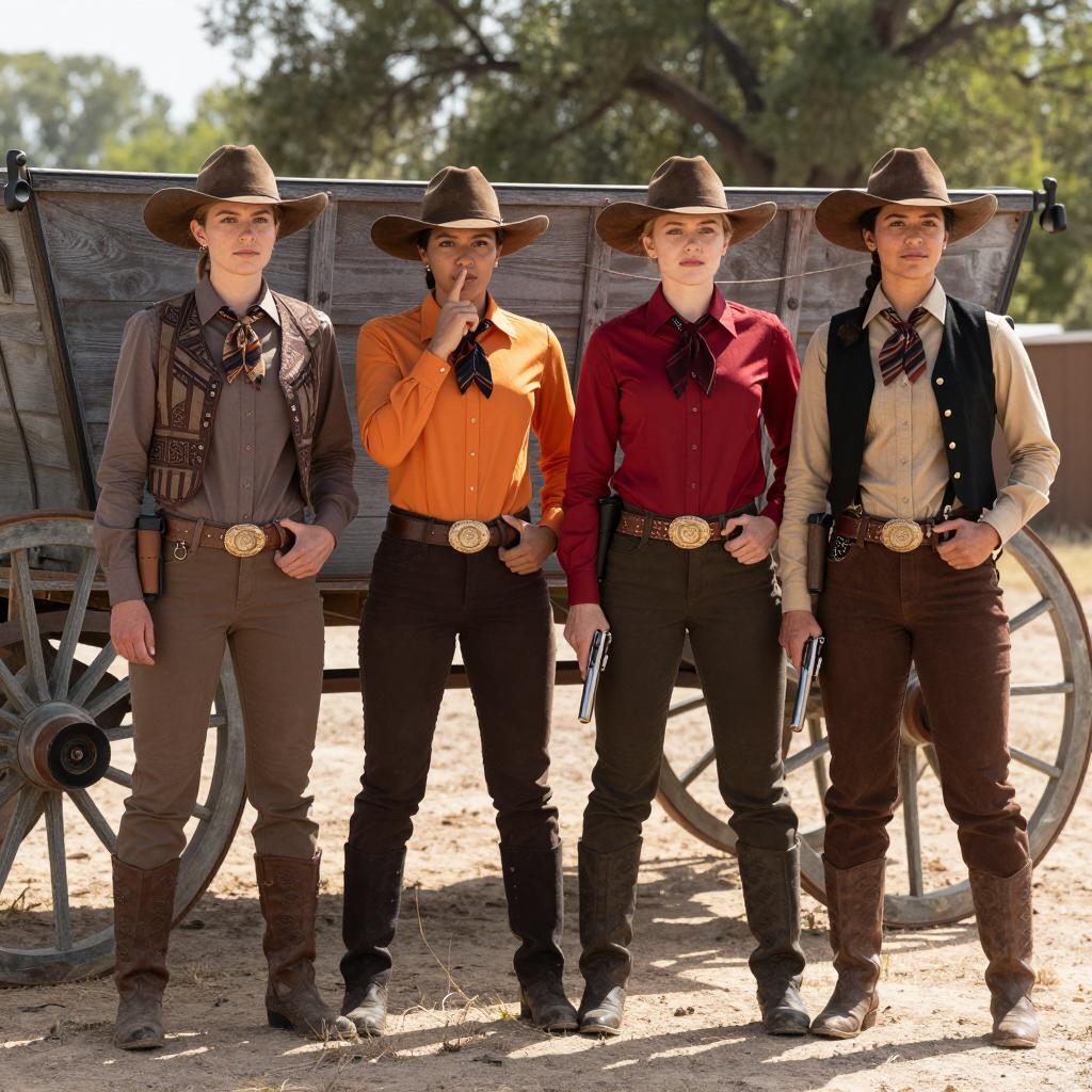 Five men standing in a dusty, Western-style town. Each wears a long coat, brown or tan, and a wide-brimmed hat. They hold revolvers in their right hands. Their expressions are serious. Background includes wooden buildings and a burning structure. The men are positioned in a slight curve, facing forward. The man in the center has darker hair and a stern expression. The man on the far right has a beard. The ground is muddy.