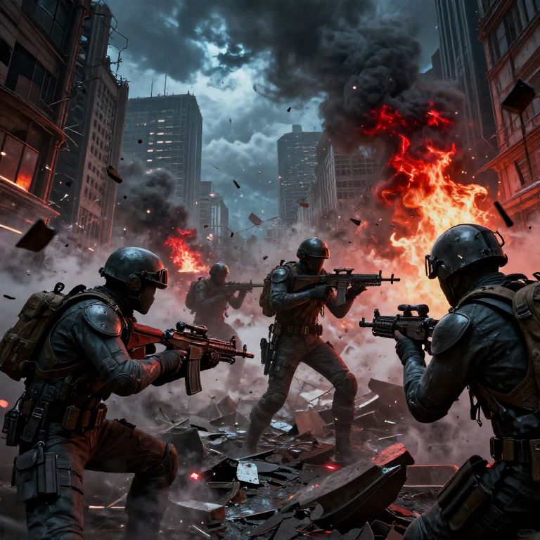 A highly detailed, dynamic digital artwork depicts three heavily armed soldiers in full tactical gear, including helmets and backpacks, engaging in an intense urban firefight. They stand amidst a chaotic scene of exploding buildings and debris, with vivid red and orange flames contrasting against dark smoke and a stormy, cloud-filled sky. The soldiers, wielding assault rifles, are positioned in a triangular formation, with the background showcasing tall, damaged skyscrapers. The image's dramatic lighting and realistic textures emphasize the danger and intensity of the battle.