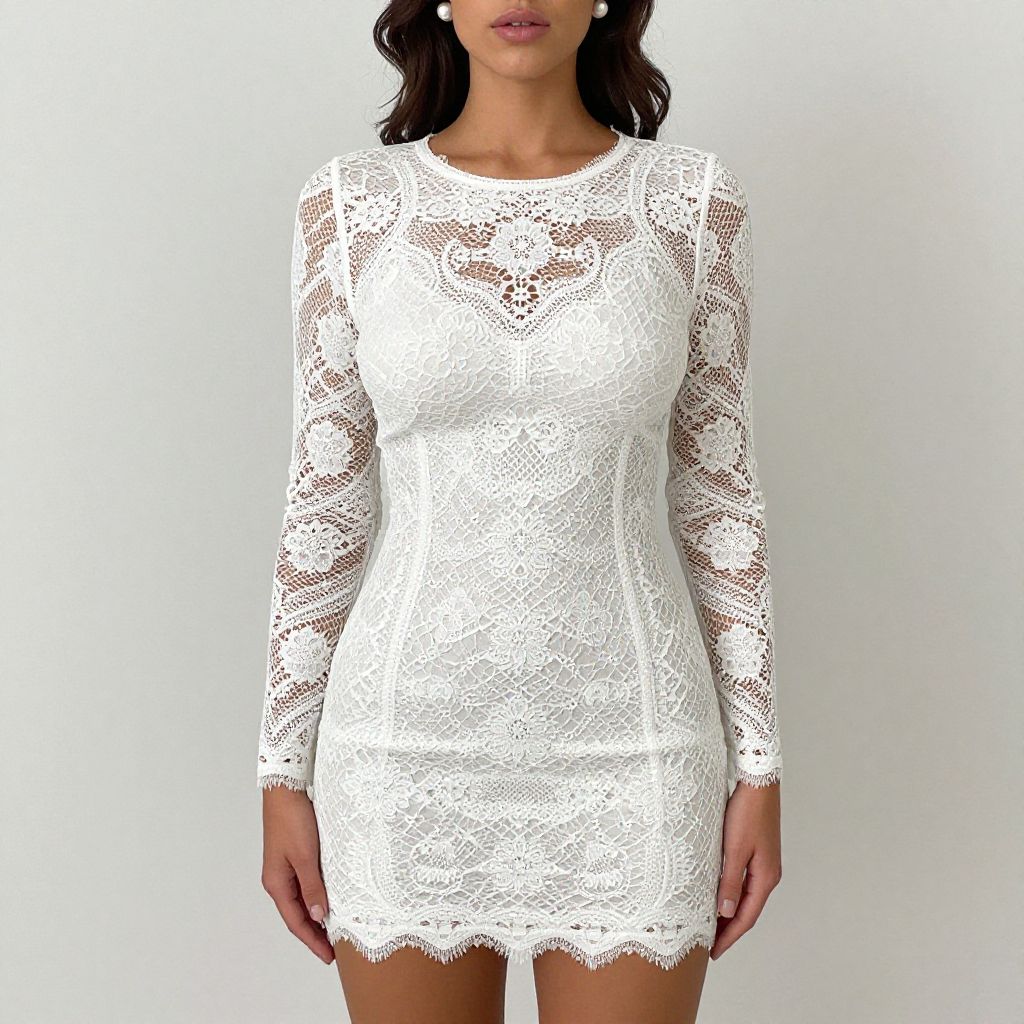Photograph of a woman in a white, long-sleeved, lace mini dress with intricate floral patterns, standing against a plain white background.