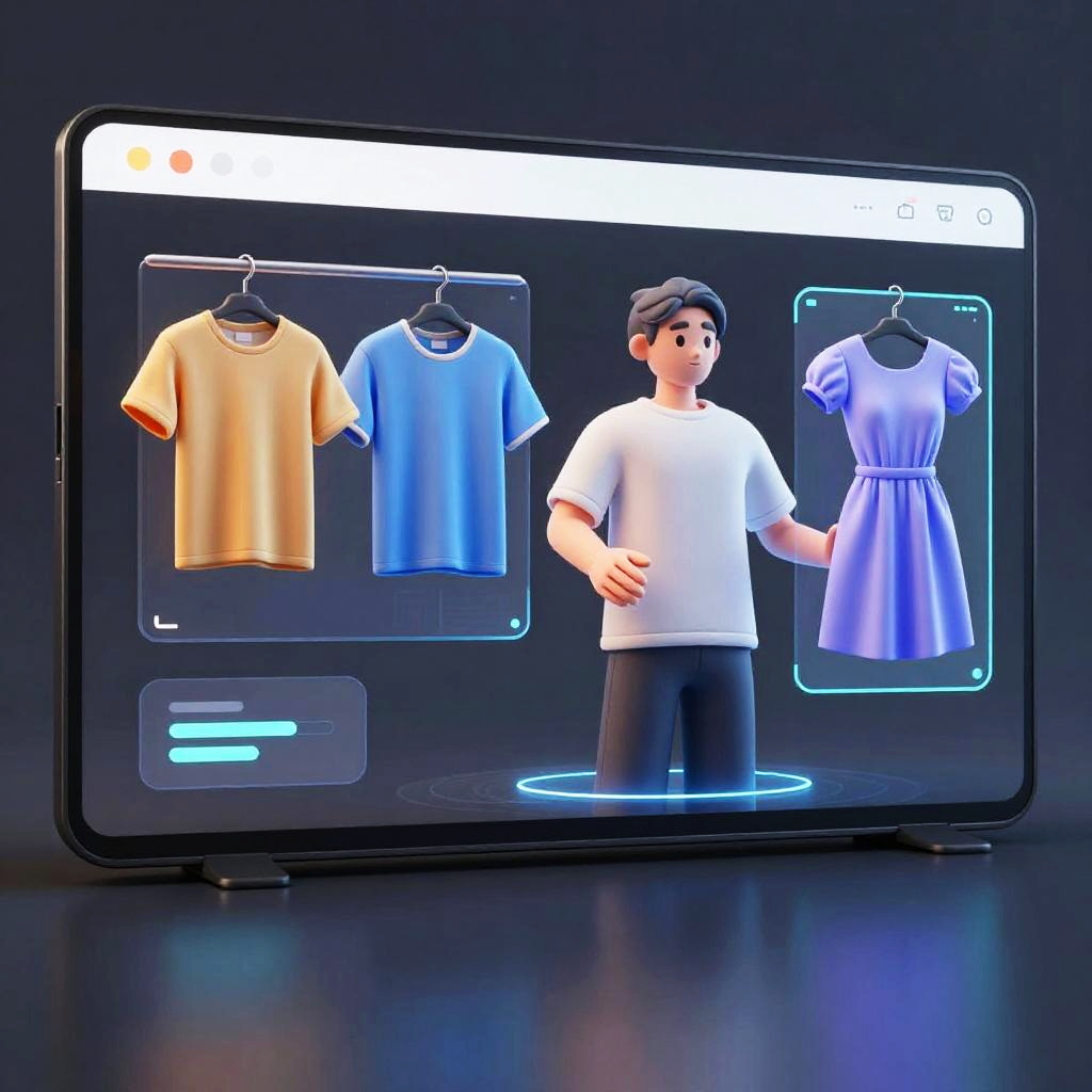 Remove clothes online theme, artistic depiction of seamless virtual wardrobe management, holographic clothes being detached from a 3D avatar in a sleek digital environment, modern UI elements and smooth animation effects, futuristic tech vibe