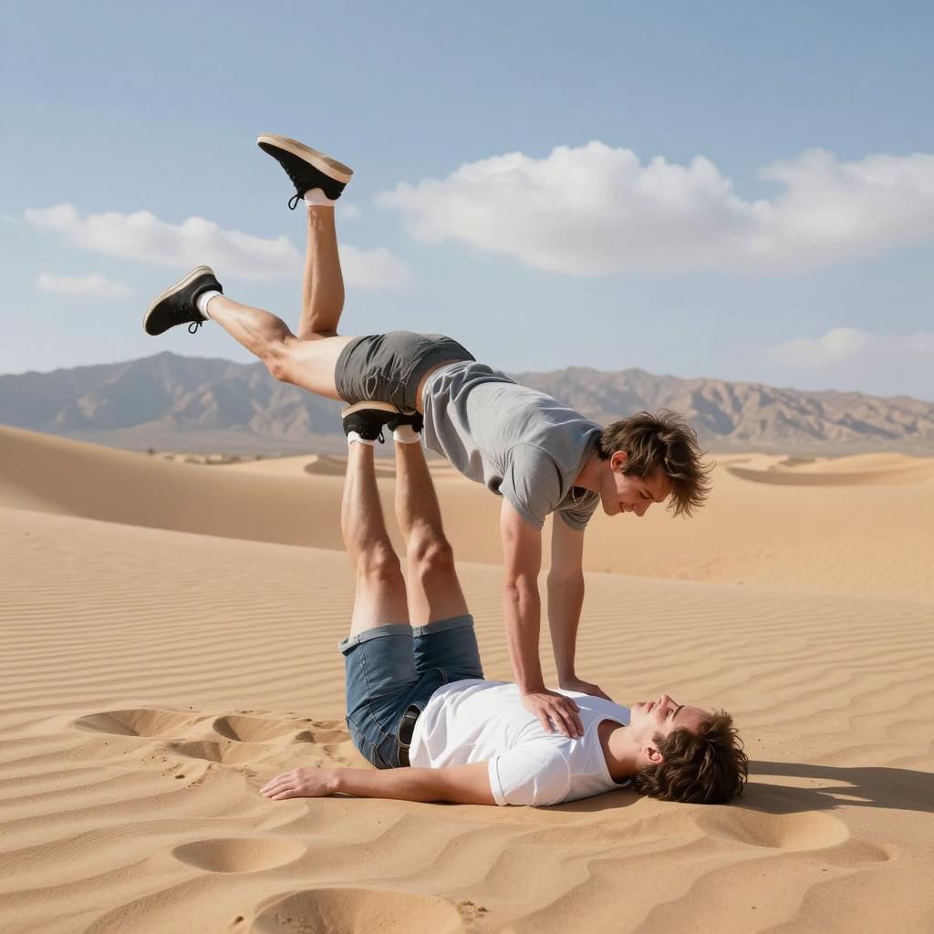 Two people in a desert with rippled sand. One with brown hair, gray t-shirt, and gray shorts balances on one arm, lifting the other person's legs. The other person has short brown hair, white t-shirt, and denim shorts, lying on the sand with legs in the air. Both wearing black sneakers. Mountains and scattered clouds in the background.