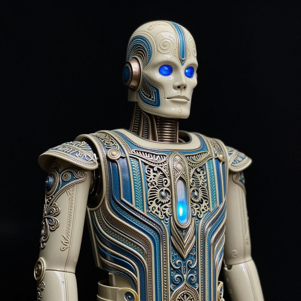 A cyberpunk-style Art Deco Tin Man with intricate rococo details, featuring filigreed cream and blue textures, dramatic lighting, and a gel-like light source.