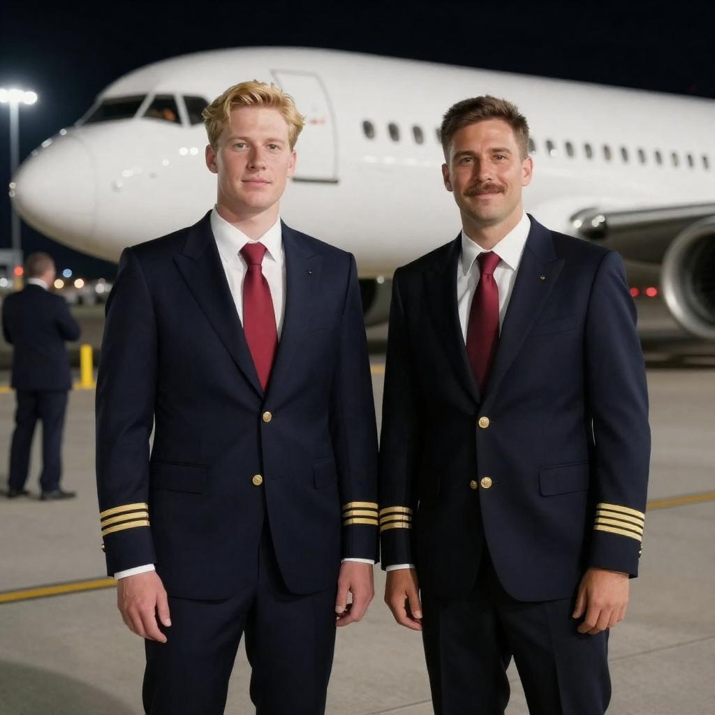 Photograph of two male airline pilots standing side by side at night, in front of a brightly lit airplane. Both wear dark navy blue pilot uniforms with white shirts and red ties. The pilot on the left has blond hair, while the one on the right has brown hair and a mustache. The background shows other people and airport lights.