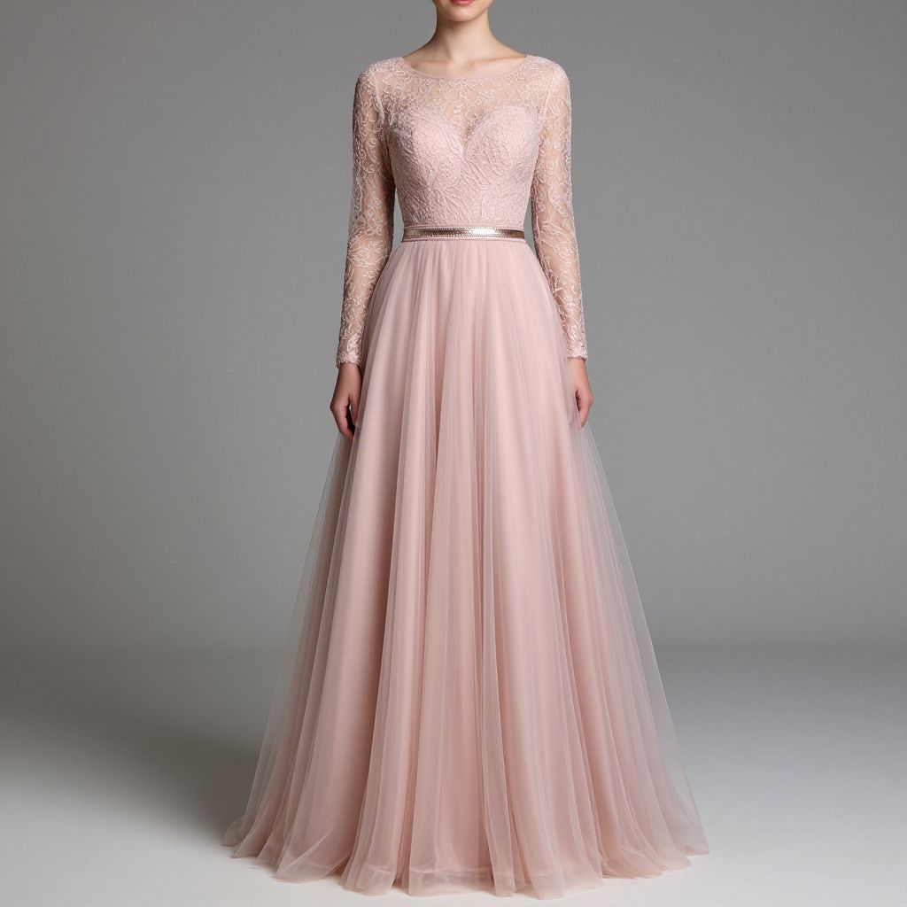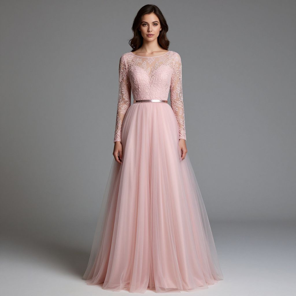 Elegant woman showcasing a floor-length, pink A-line prom dress with long sleeves, featuring intricate lace detailing above a sheer neckline and a flowing tulle skirt accentuated by a delicate waistband.
