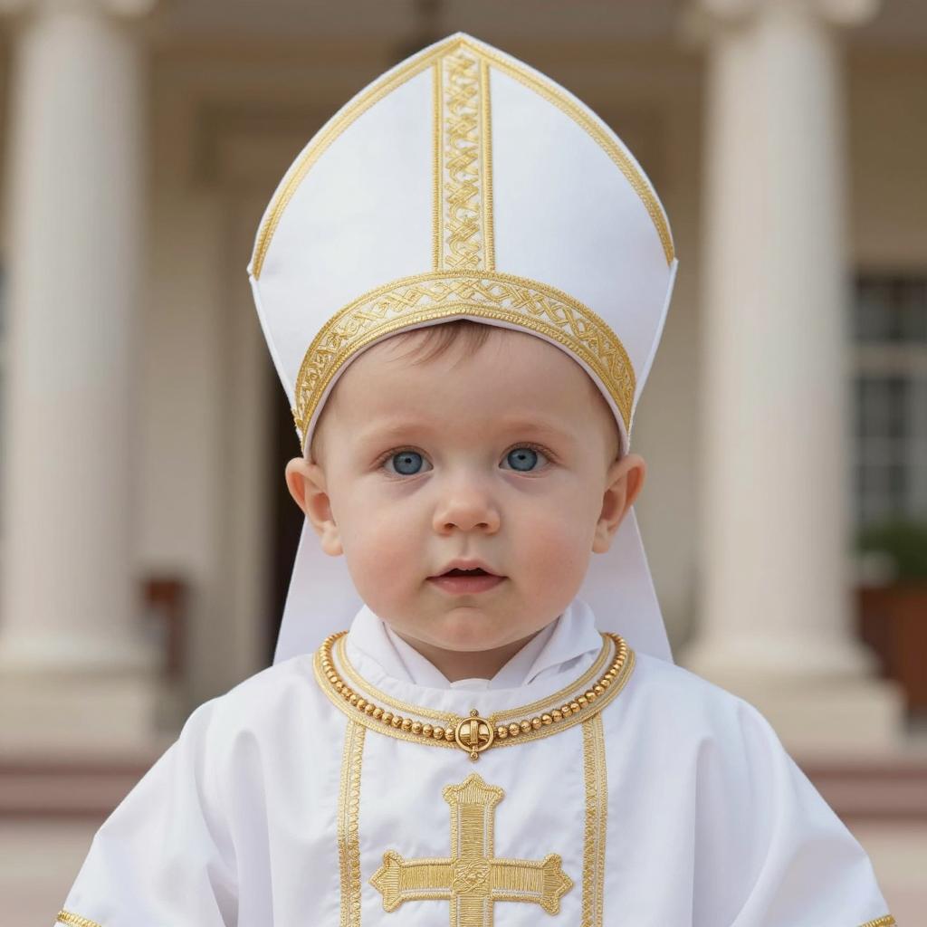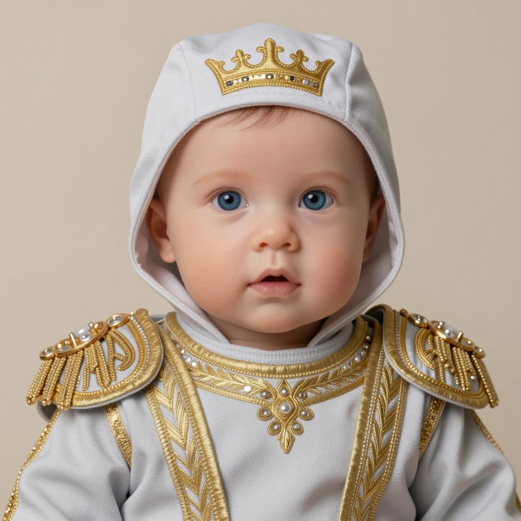 Infant thanos costume, photorealistic baby doll wearing elaborate, royal-style, light gray and gold embroidered outfit with detailed shoulder epaulettes, white hood with gold crown emblem, large round blue eyes, neutral expression, soft lighting, beige background, studio portrait, realistic ure, realistic style, close-up, centered composition, high detail, realistic fabric ure, realistic metallic accents, portrait orientation