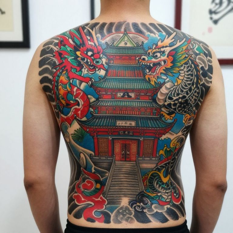 Photograph of a back tattoo on a person's upper and mid-back, featuring an intricate, colorful Asian-inspired design with a mix of dragons, traditional Chinese architecture, and detailed patterns. The tattoo includes bright reds, blues, and blacks, with a mix of smooth and textured shading. The background is a brightly lit indoor setting with a hint of modern decor.