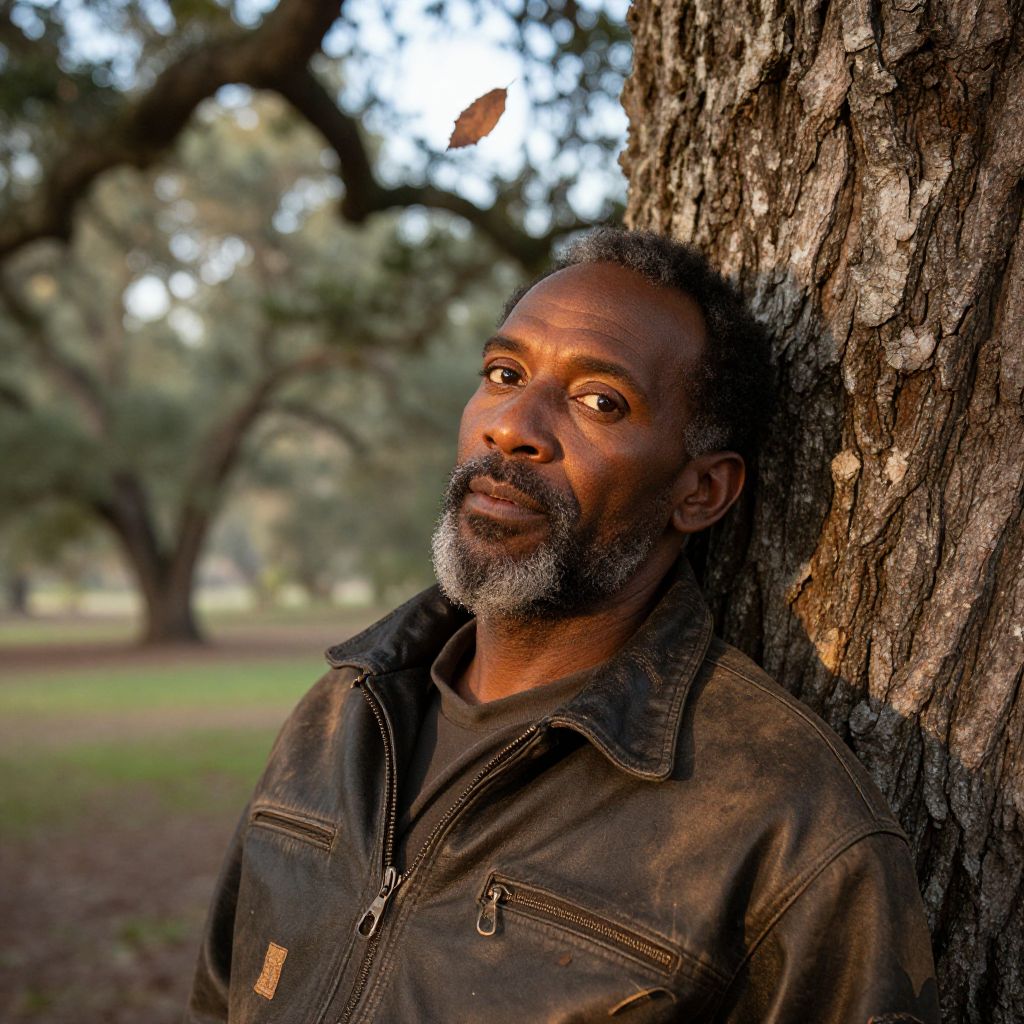 Photograph a 35-year-old Caribbean man with a salt-and-pepper beard and an air of rugged gentleness. Capture his portrait from a unique angle, slightly below eye level, as he leans against an ancient oak tree in a serene forest clearing. The soft golden light of dawn bathes the scene, illuminating his deep, contemplative eyes that convey wisdom and resilience. His worn leather jacket, adorned with subtle patches and scuffs, hints at life's journey. Above him, a solitary leaf floats lazily, symbolizing nature's impermanence within this intimate portrait.