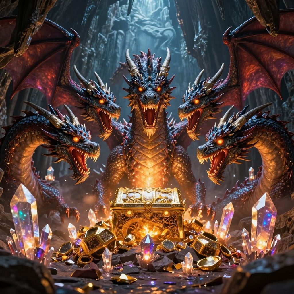 Multi head dragon guarding a treasure hoard inside a cavern, glowing crystals illuminating the scene, heads snarling and eyes bright with intelligence, vivid fantasy environment