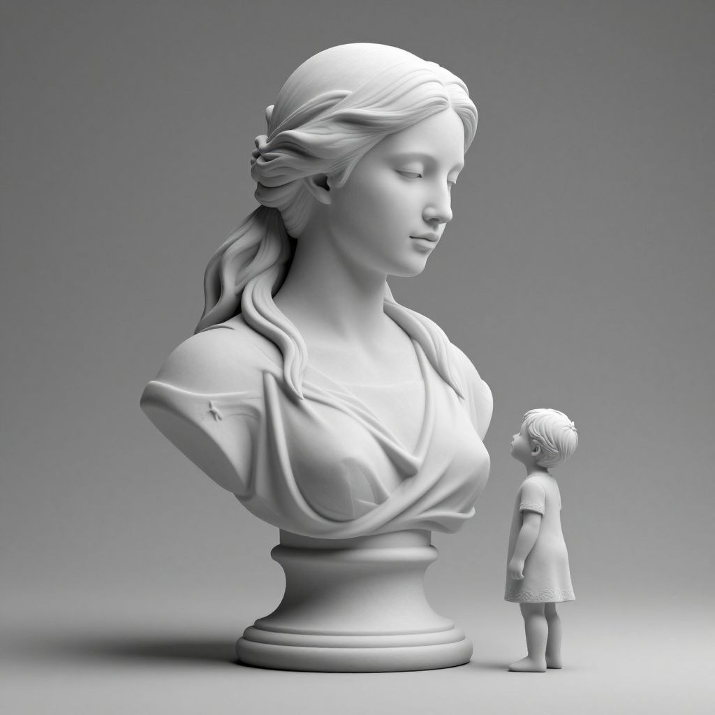A computer-generated 3D render depicts a serene and surreal scene where a colossal bust of a woman with flowing hair stands beside a miniature child, both carved from a monochromatic stone-like material, evoking a sense of quiet contemplation and timeless craftsmanship.
