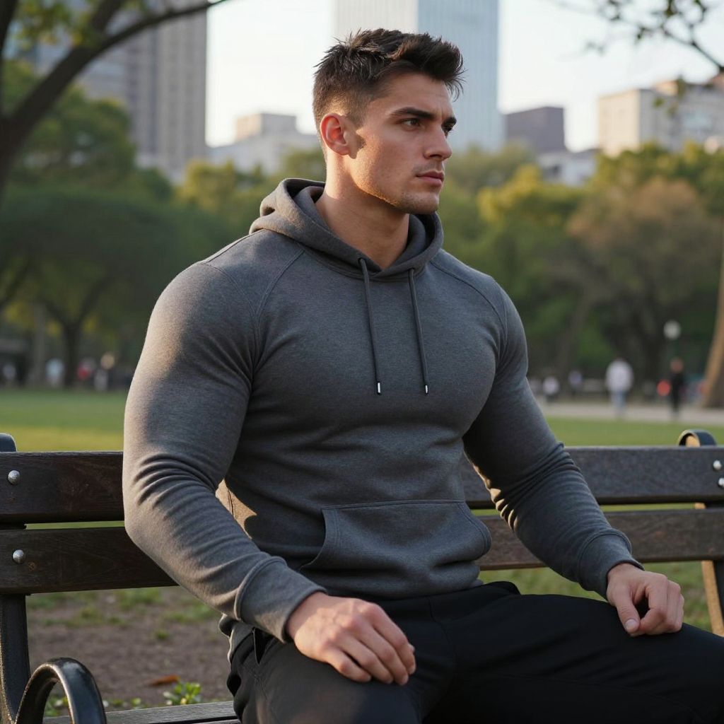 A realistic photograph of a tall, athletic man with defined cheekbones and a strong jawline in a figure-fitting hoodie that contours to his body, sitting on a park bench during early morning sunlight, with green trees and a city skyline in the background, highlighting how the hoodie fits his body shape seamlessly.