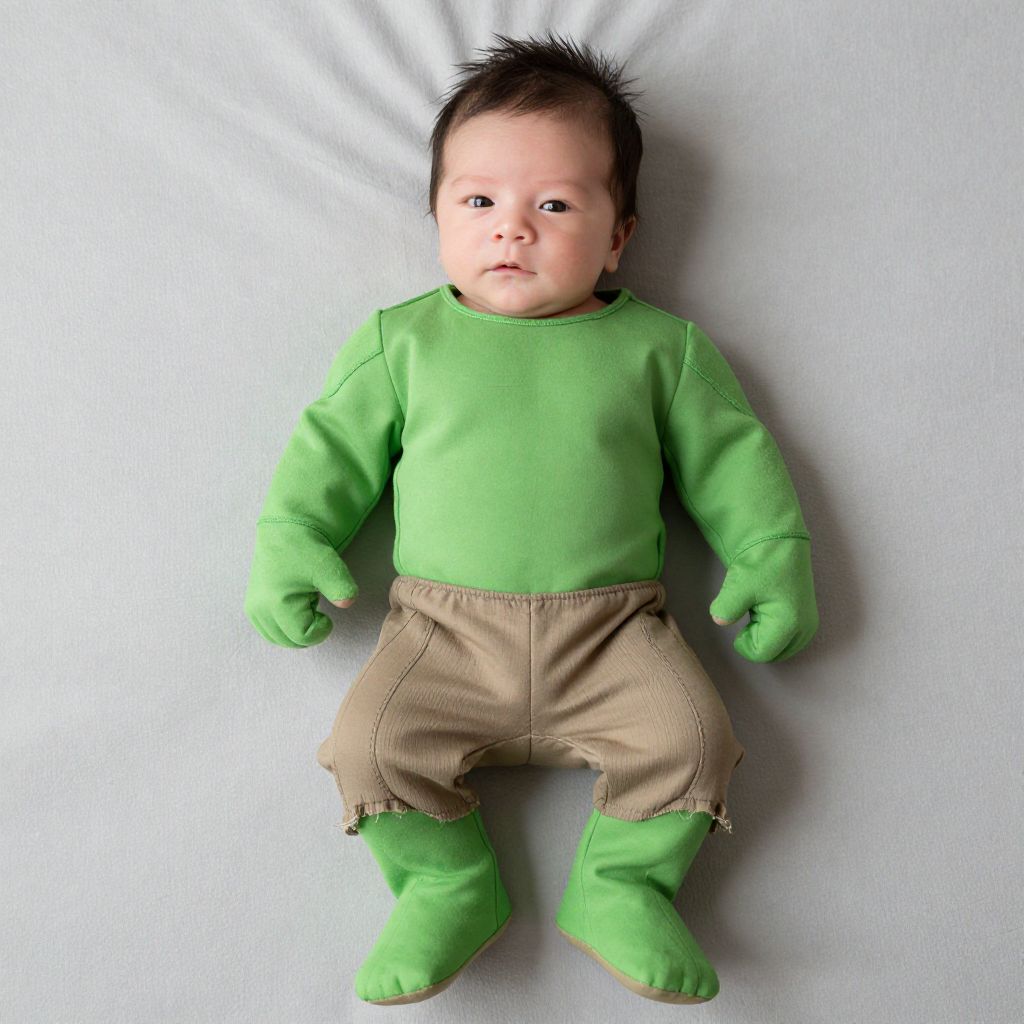 Newborn Hulk Costume, boy in green shirt and tan pants posing for a picture