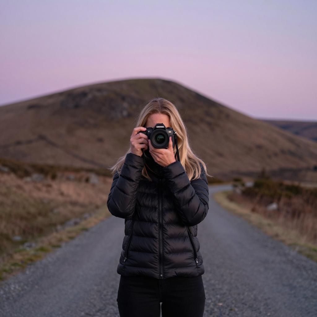 Blonde woman with long hair, dressed in a black puffer jacket and black pants, holding a camera to her face while standing on a gravel road. The background features a large brown hill under a soft pink and purple sky, suggesting early morning or evening light. The setting is an open rural landscape.