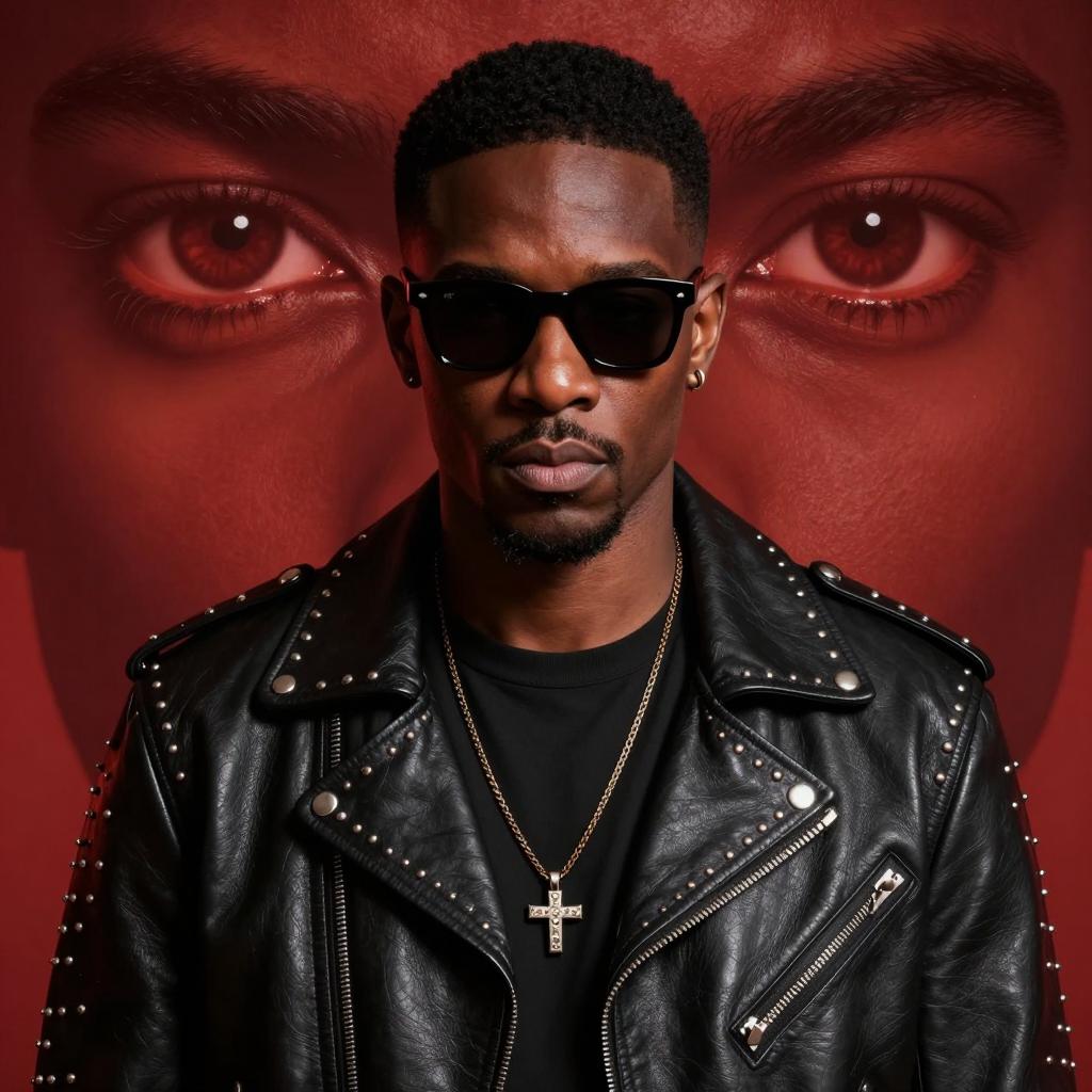 A Black man with short black hair, wearing a shiny black leather jacket with red accents, holding a black microphone in his right hand. He has a slight smile and raised eyebrows, with a blue light in the background.