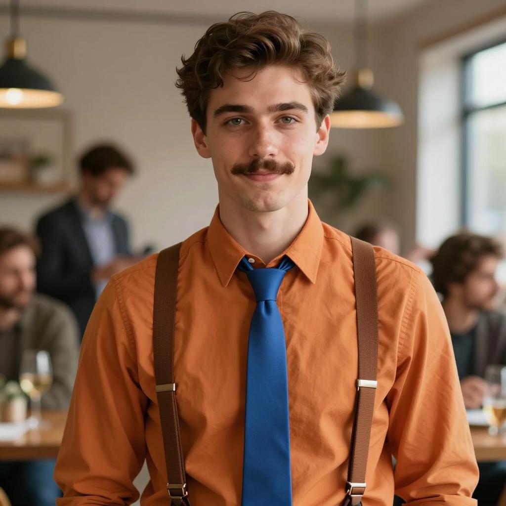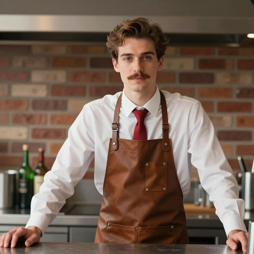 Bartender outfit male dress, photorealistic portrait of handsome young man, brown hair, mustache, white shirt, red tie, brown leather apron, standing in kitchen, hands on counter, blurry background with brick wall and green bottle, daytime, soft lighting, realistic ures, slight vignette, professional bartender or chef, clean and modern look, high detail, realistic colors