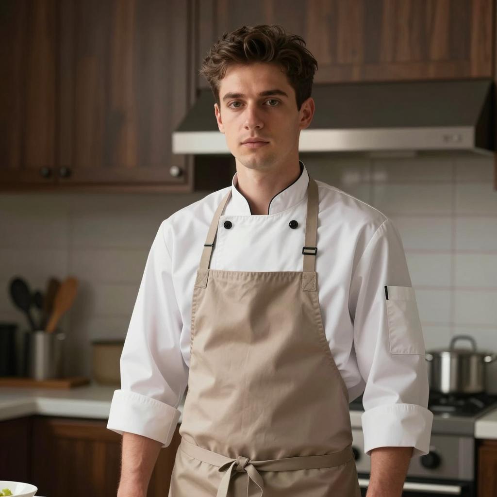 Portrait of a handsome young man with brown hair and mustache wearing a white shirt, red tie, and a brown leather apron. He is standing with his hands on a counter in a modern kitchen setting with a brick wall and bottles in the background. The image features soft daytime lighting and a professional, clean look.