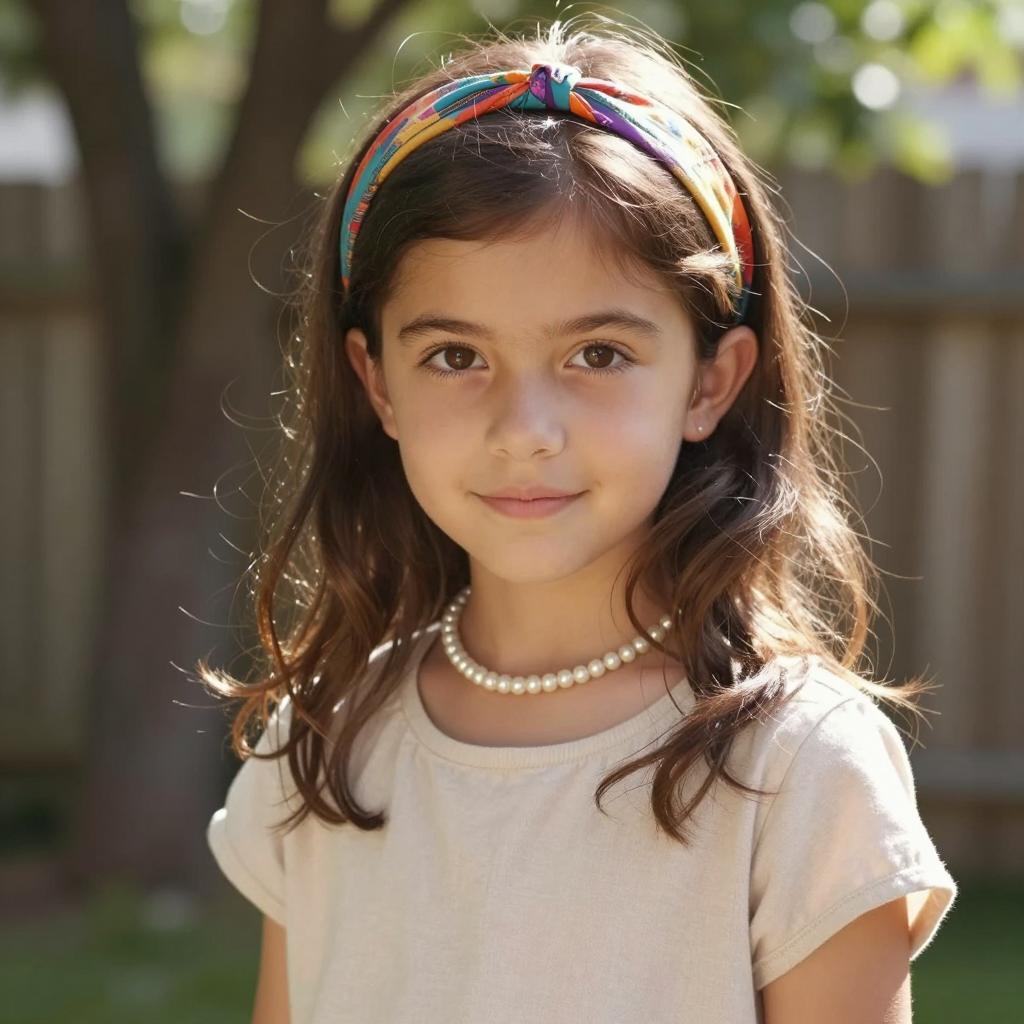 Portrait of a young girl with light brown hair in a messy bun wearing a pink spaghetti strap tank top and matching pink ballet skirt. She stands in a vibrant garden with colorful flowers including pink, orange, and red blooms. The background features green plants and a blurred blue building. The photo is taken on a sunny day with soft natural light and a bokeh effect, emphasizing the detailed features and serious expression of the girl.
