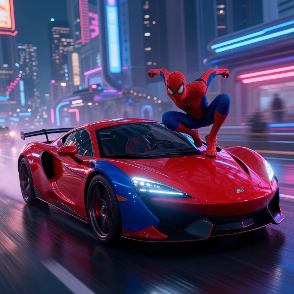 Spiderman in a car, dynamic scene featuring a high-tech red and blue sports car speeding through a futuristic city at night, neon lights reflecting off the wet pavement, Spiderman leaning out the window in his classic suit, vibrant, cinematic lighting, detailed urban background