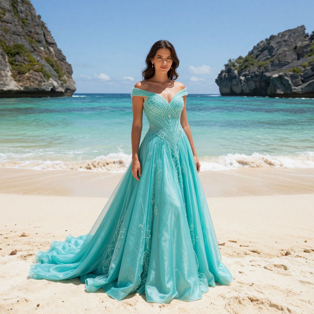 Photograph of a young woman with wavy dark brown hair standing on a sunny beach with turquoise water and rocky cliffs in the background. She wears an off-the-shoulder, floor-length, turquoise gown with intricate beadwork and a flowing, sheer skirt. The dress has a fitted bodice that accentuates her slim figure. She stands confidently with her arms relaxed by her sides. The bright blue sky and clear, calm sea create a picturesque tropical setting. The sand is light beige, and the cliffs are rugged and dark. The overall mood is elegant and serene.