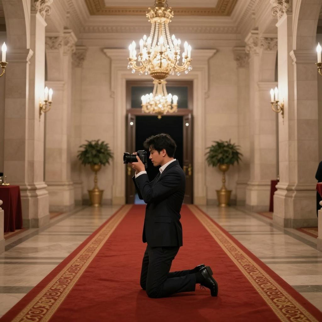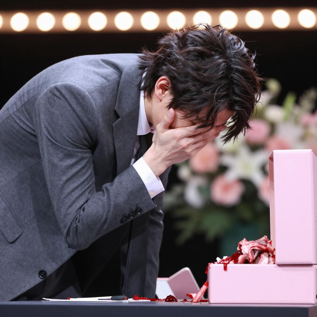 Man in black suit and white shirt, lying on blue stage floor, arms and legs outstretched, under bright stage lights. Large crowd in background, many holding cameras and phones. Camera operator standing to the right, focused on man. Intense stage lights create starburst effect.