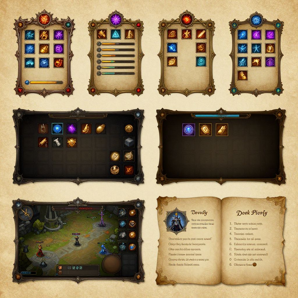 A game UI portfolio featuring medieval fantasy-themed user interface elements, ornate frames, magical icons, parchment textures, beautifully crafted skill bars, inventory screens, and character stats panels with elegant calligraphy and warm color schemes.
