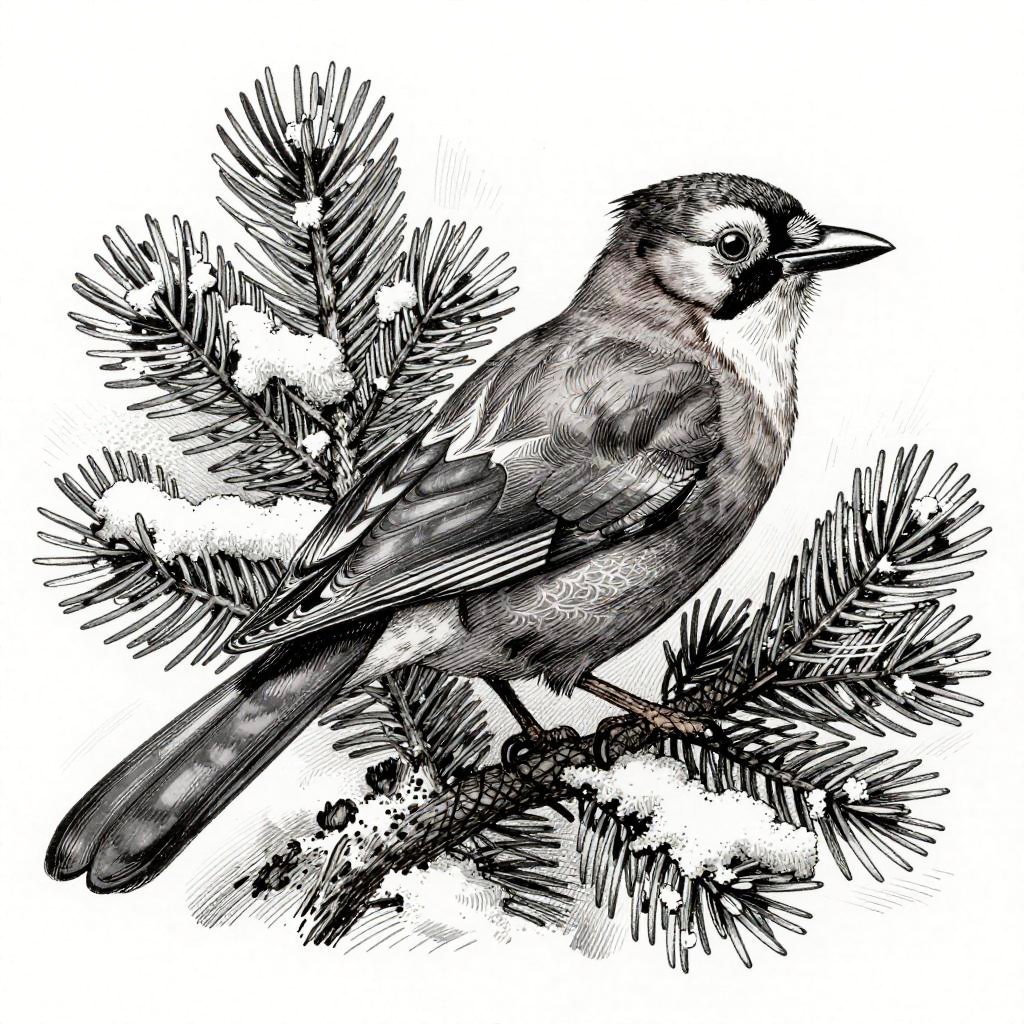 A detailed monochrome linocut sketch depiction of a grey jay perched, set in coniferous branches dusted with light snow, realistic feather texture, intricate crosshatching and line shading, black and white palette, precise natural anatomy and rosette patterns, high-contrast chiaroscuro with deep blacks and crisp highlights, balanced composition, dynamic negative space, directional strokes suggesting motion, subtle ink bleed and paper grain, museum illustration aesthetic, archival print texture, timeless graphic character