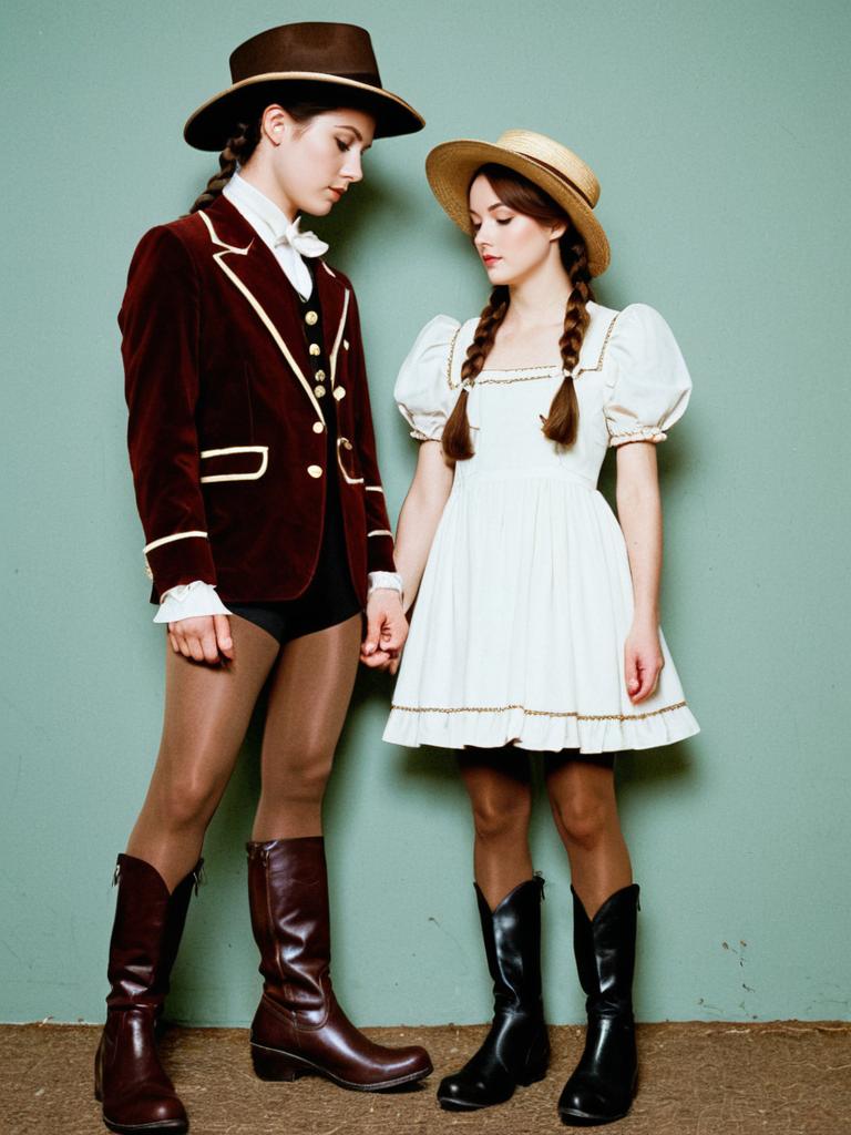 Stepsister costume, solo, hat, crossdressing, 1boy, male focus, brown hair, dress, realistic, twin braids, standing, 1girl, pantyhose, closed eyes, boots