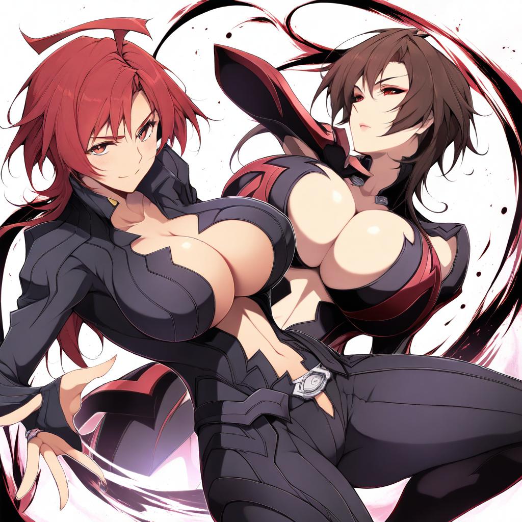 Illustration of two mature female anime characters with large breasts in tight black and red combat outfits. One character has short brown hair and brown eyes, the other has long red hair and brown eyes, both showing confident expressions. The image features dynamic poses and detailed shading, inspired by the Witchblade series style.