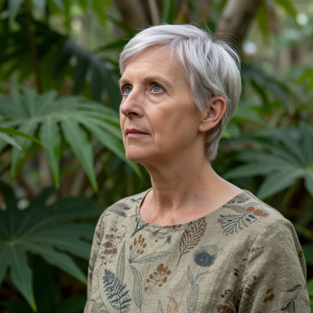 Photograph of an elderly woman with short, silver-gray hair and fair skin, standing outdoors against a backdrop of lush, green tropical foliage. She wears a beige, floral-patterned blouse featuring muted blue, brown, and green flowers. Her expression is thoughtful, with blue eyes looking slightly to the right. The texture of her blouse appears slightly coarse, contrasting with the smoothness of her skin. The natural light highlights the wrinkles on her face, adding depth to her expression. The background is slightly blurred, emphasizing her as the focal point.
