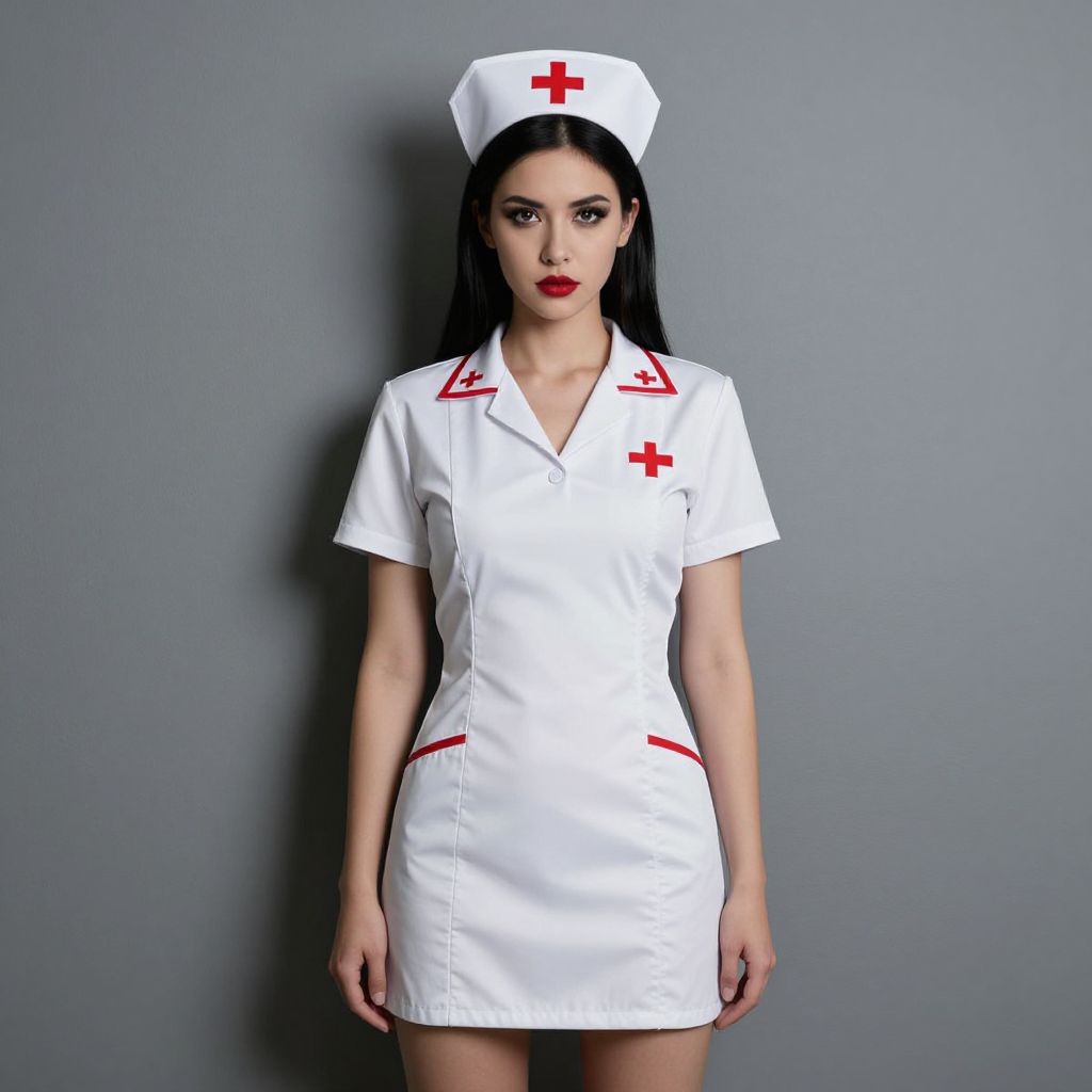 Photograph of a fair-skinned woman with long black hair, wearing a white nurse's uniform with red cross emblems on the hat and sleeves. Her dress is short, form-fitting, and has red accents on the sides. She has red lipstick and a serious expression. The background is a plain gray wall. The nurse's hat is a traditional shape with a white crown and red cross. The image has a high-contrast, slightly stylized look, with sharp shadows and bright lighting highlighting her figure.