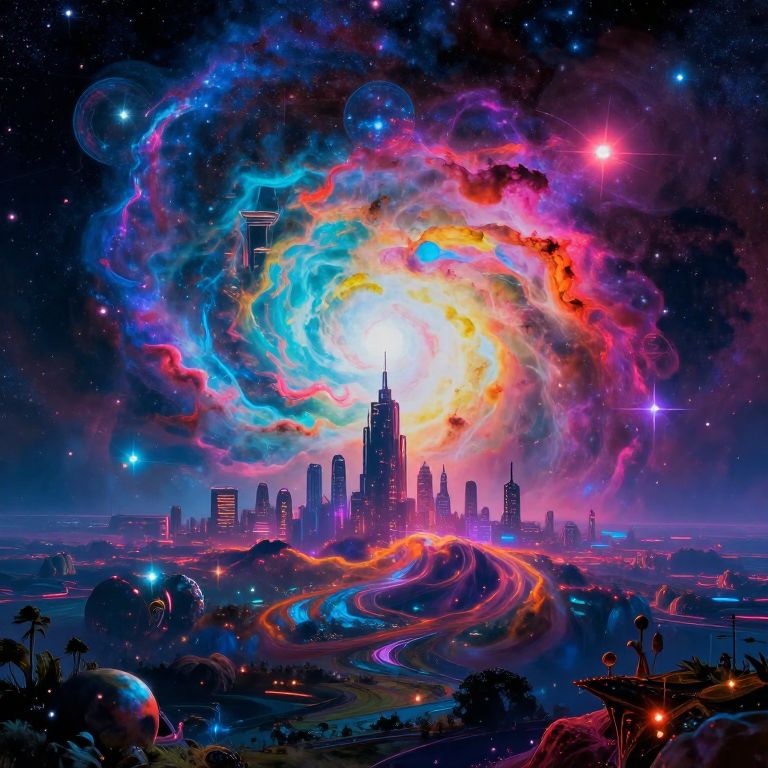 3000x3000 cover art featuring a surreal cosmic landscape with vibrant nebulae and glowing stars, a futuristic city skyline in the background, blending abstract and sci-fi elements with bright, neon colors and intricate details, perfect for an album cover.