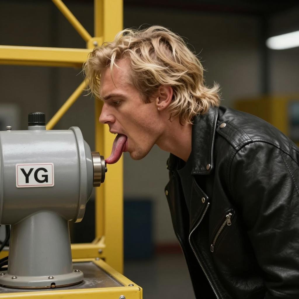 A blonde man with wavy hair, wearing a black leather jacket, leaning forward with his tongue extended to touch a large, gray, cylindrical machine. Yellow metal structure is in the background. His expression is intense. The machine has a label with "YG" on it. The man is in profile, facing left. The background is dark and ured.