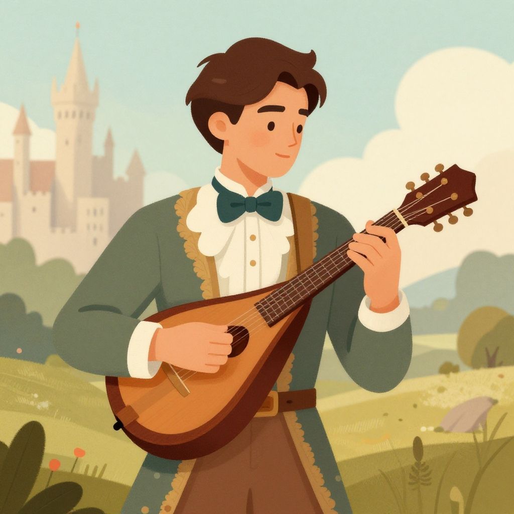 This artistic illustration features a young man dressed in a whimsical outfit, playing a mandolin. The background showcases a serene landscape with a distant castle, all rendered in a stylized, vintage-inspired aesthetic that melds fantasy and elegance.