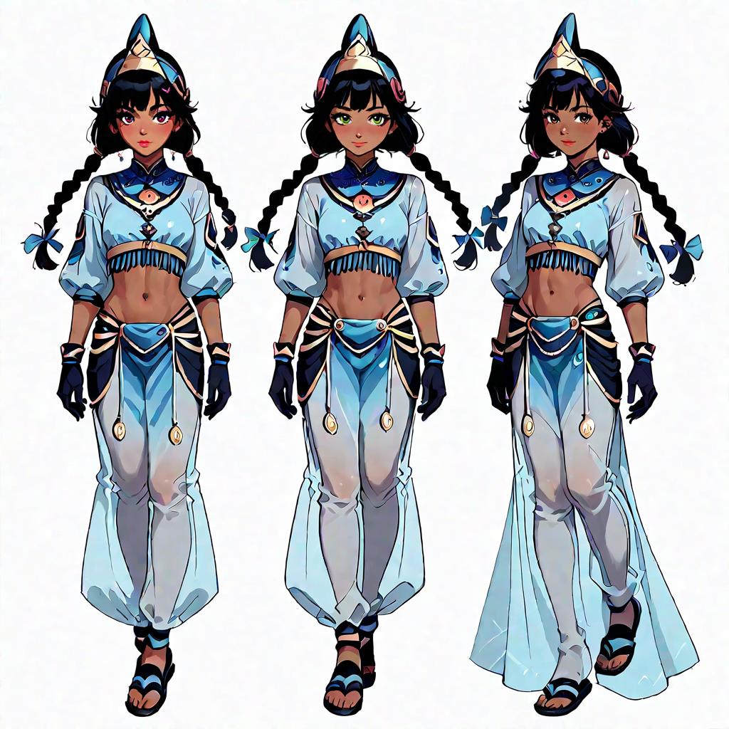 Score_9, score_8_up, score_7_up, score_6_up, score_5_up, score_4_up, source_anime, multiple views, front and side, full body, 1girl, talim, black hair, twintails, braid, dark skin, navel, midriff, hat, arabian clothes, gloves, sandals, see-through harem pants