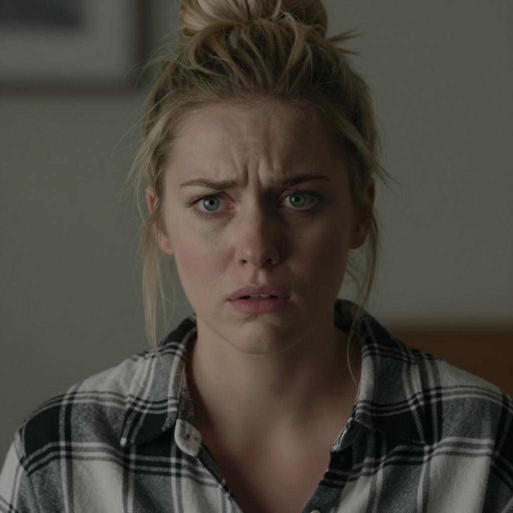 Caucasian woman with short blonde hair, wearing a red plaid shirt, stands in a dimly lit grocery store aisle. She looks to the left with a slightly open mouth. Shelves filled with various packaged goods are in the blurred background. She has a slight frown. The image is a photograph.