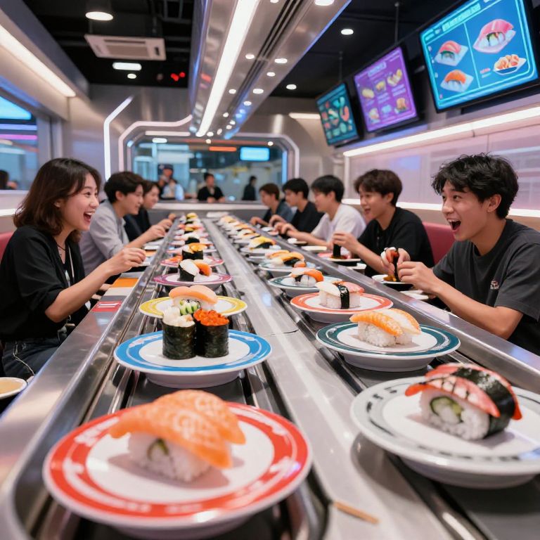 Sushi rush in a futuristic conveyor belt restaurant, colorful sushi plates flying past excited diners, sleek metallic interiors with holographic menu displays, fast-paced dining action