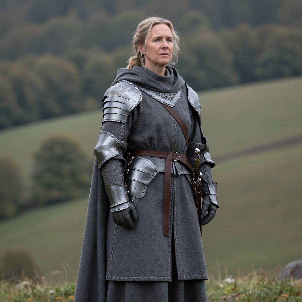 Embellishment a middle-aged woman in medieval armor and a grey cloak, she stands on a hill with rolling woodland behind her,