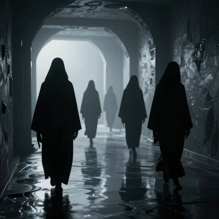 Photograph of five silhouetted figures in hooded robes walking down a dimly lit, wet, arched tunnel. The figures are in various positions, with three closer to the foreground and two further back. The tunnel's walls are textured and graffiti-covered, and the glossy, reflective floor adds a moody, eerie atmosphere. Bright white light at the tunnel's end contrasts with the dark, blue-tinted interior, creating a dramatic, almost cinematic effect. The overall scene evokes a mysterious, possibly supernatural ambiance.