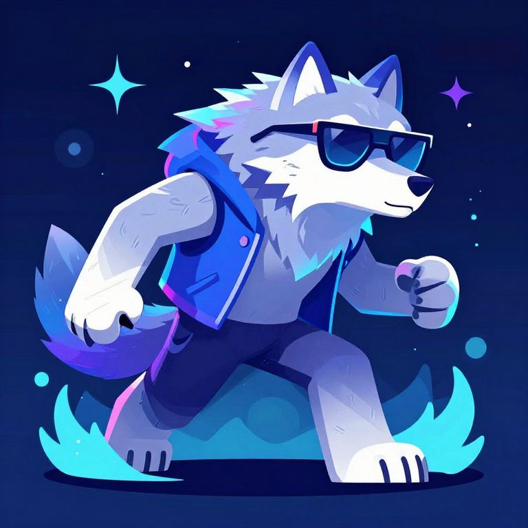 Digital illustration of a cool, anthropomorphic white wolf with blue highlights, wearing sunglasses, a blue vest, and black shorts, running with blue energy waves