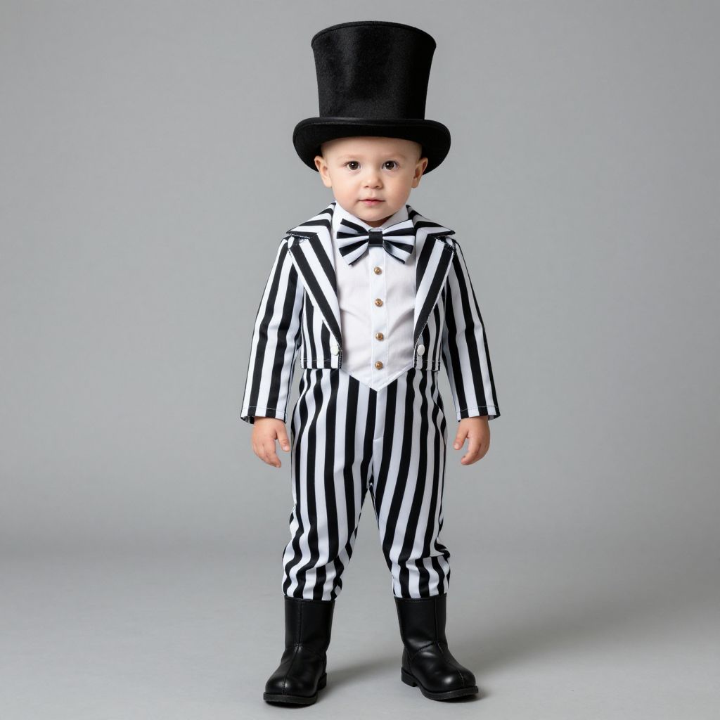 Photograph of a young child standing against a plain, light gray background. The child, with fair skin and short, light brown hair, wears a black top hat and a black-and-white striped onesie with a white button-up front. The onesie has vertical black stripes on the long sleeves and pants, and horizontal black stripes on the torso. The child also wears black, shiny dress boots. The child's expression is neutral, and their arms are relaxed at their sides. The overall style is reminiscent of a traditional magician's outfit. The image is sharp and well-lit, highlighting the contrast between the black and white stripes.