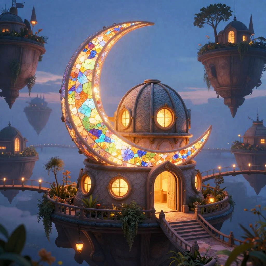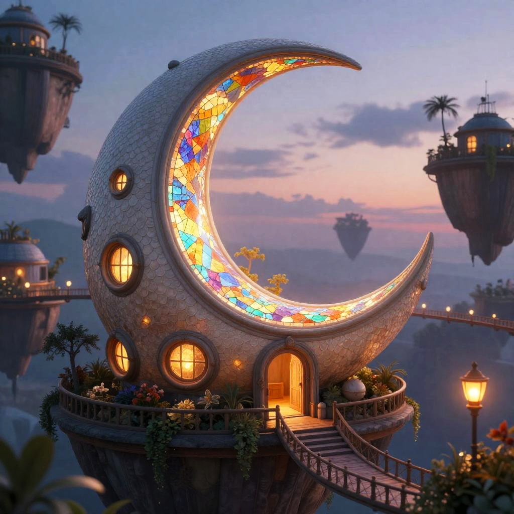 A fantasy architectural illustration featuring a whimsical crescent-moon observatory with intricate scale-like textures, a large curved doorway, and round windows emitting cozy warm light, surrounded by rooftop gardens of a floating city at twilight with suspended lantern-lined bridges, rendered in a ethereal stained-glass mosaic with luminous backlighting style, evoking a magical and inviting atmosphere.