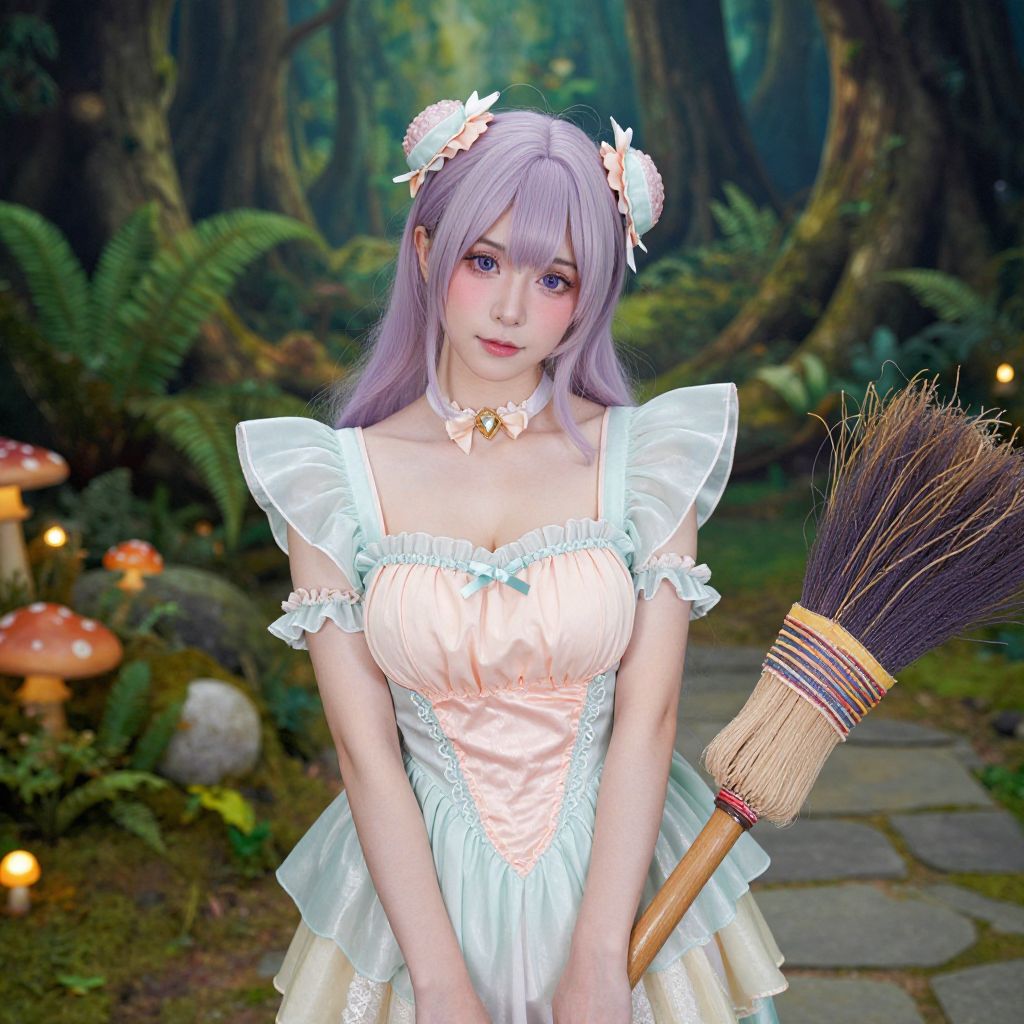 Digital anime-style photograph of a young woman with lavender hair, white floral dress, holding a broom, in a magical forest with mushrooms and ferns