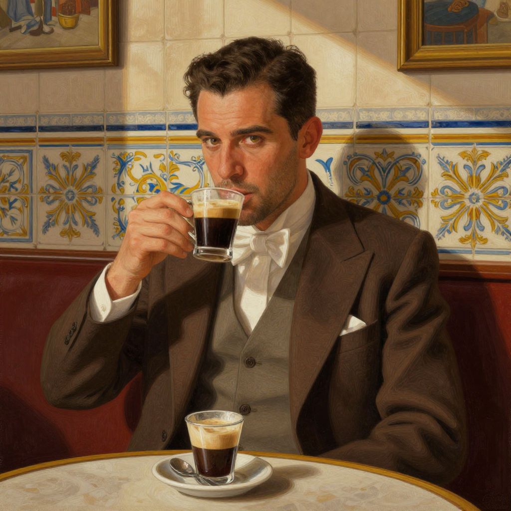Handosme in Spanish cafe, vintage ambiance, sipping espresso, ornate tiled walls, natural shadows, classic Spanish gentleman look, warm tones, sharp and detailed digital painting