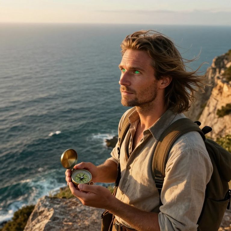 A charismatic European explorer with piercing green eyes and windswept hair stands at a rugged cliff's edge, gazing out over the vast ocean as if contemplating his next adventure. Illuminated by the golden light of sunset, he clutches an antique compass in one hand, embodying a sense of intrepid exploration. This photorealistic portrait, captured from an unusual aerial perspective, conveys not only the untamed beauty of nature but also the inner journey and awe-inspiring spirit of this explicit wanderer.