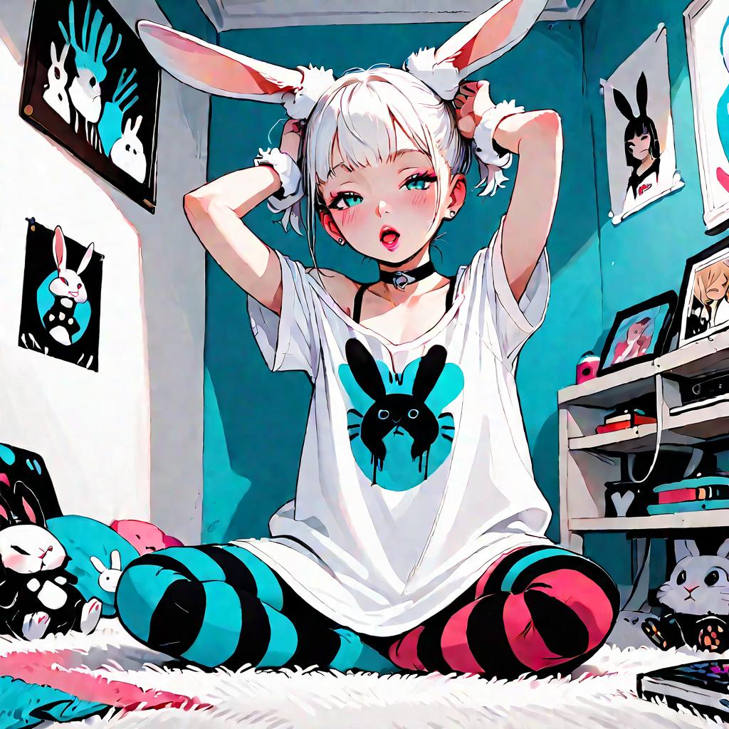 (score_10, score_9_up, score_8_up), very strong contrast, dramatic Lighting, very high detailed, very gorgeous and complicated background, 8k, 4k, highres, hadrian, 1 girl, full body, apartment, room, messy room, anime poster, white hair, Headbands, oversized t-shirt, choker, short twintails, hair ornament, asymmetrical legwear, flat chest, blush, fur cuffs, downblouse, striped legwear, multicolored legwear, alluring eyes, half-closed eyes, rabbit ears, rabbit_pose, bunny print, looking at viewer, rabbit paint, poster, strap camisole inside, no shoes, (white eyelashes:0.95), :<, open mouth, aqua eyes, arms up, leaning back