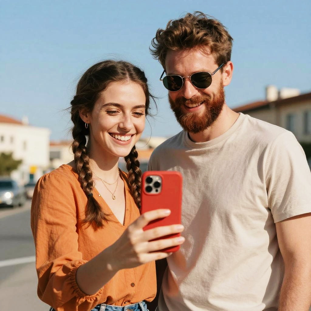 A bright photograph of a smiling couple taking a selfie outdoors. The woman, with braided hair and an orange blouse, holds a red phone while the bearded man in a beige t-shirt stands behind her. Both are laughing and the background shows a clear blue sky and blurred buildings. The woman's necklace and the man's sunglasses add to the casual, joyful vibe.